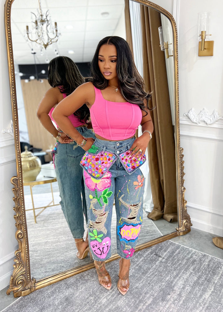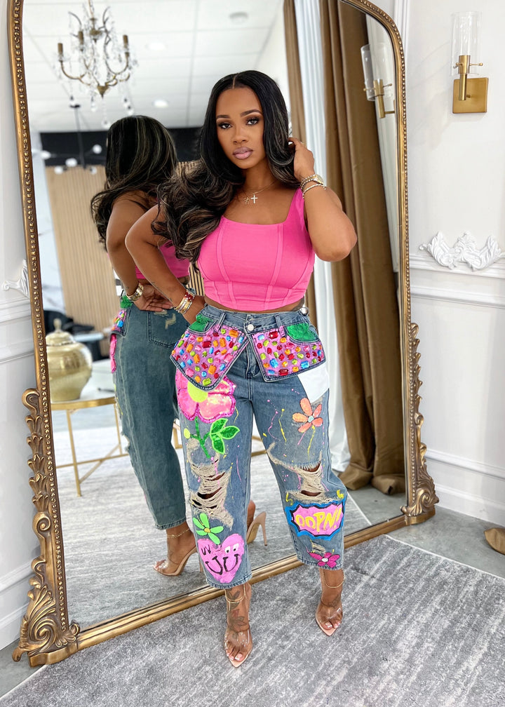 Model 5’2 wearing a size small elastic waist for stretch 100% cotton loose fit model is a size 5 in jeans