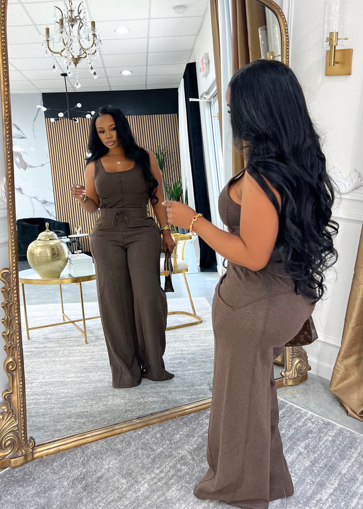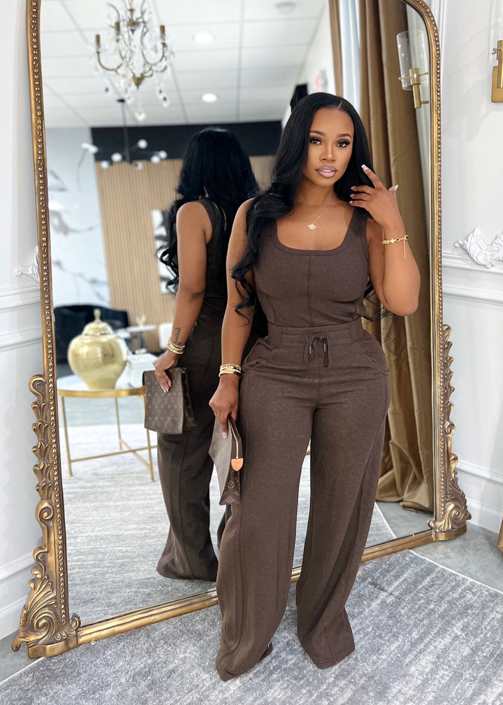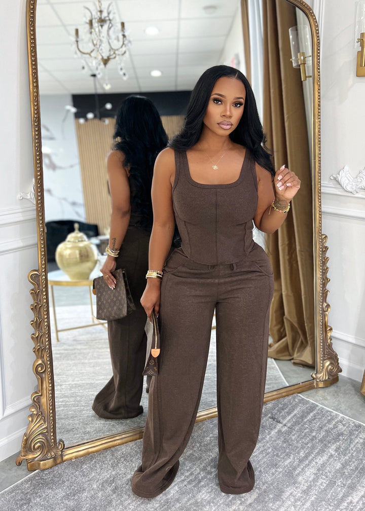 Model 5’2 wearing a size small good stretch corset style top wide leg drawstring pants 58% cotton 42% polyester