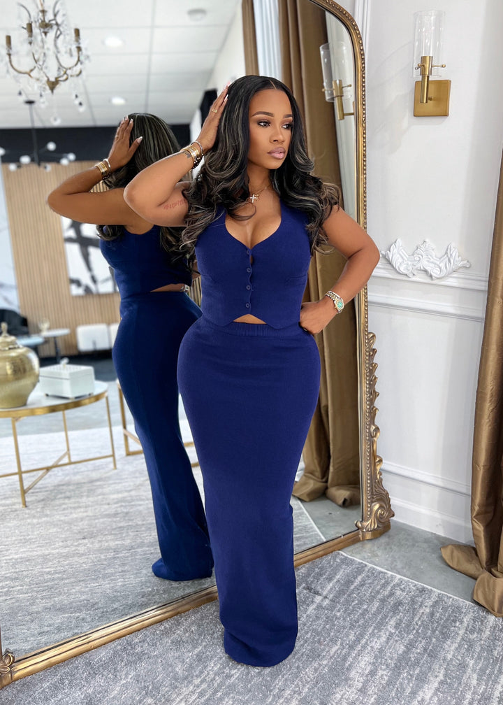Model 5’2 wearing a size small great stretch front button closure top maxi skirt no closure 95% polyester 5% spandex