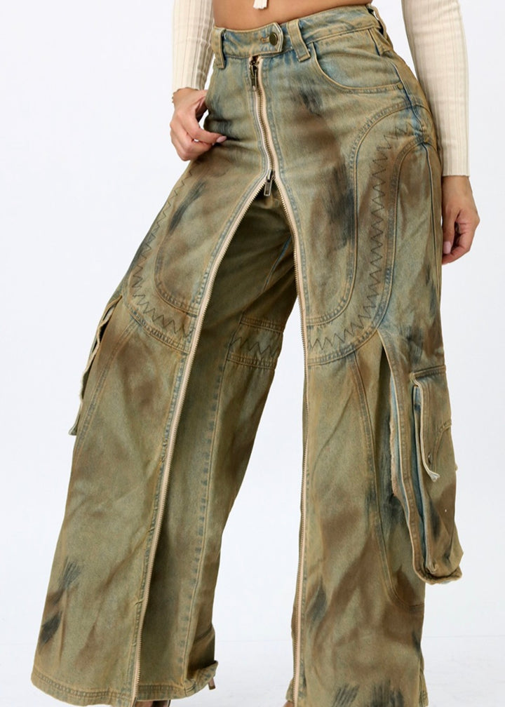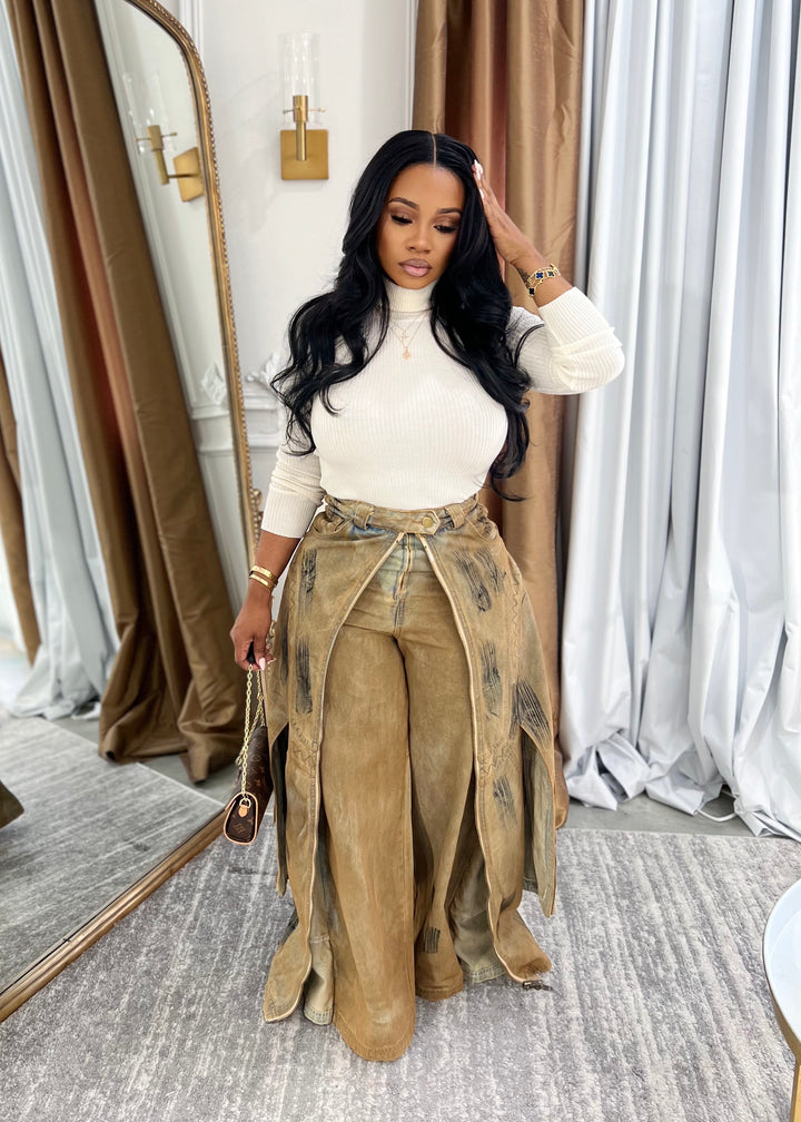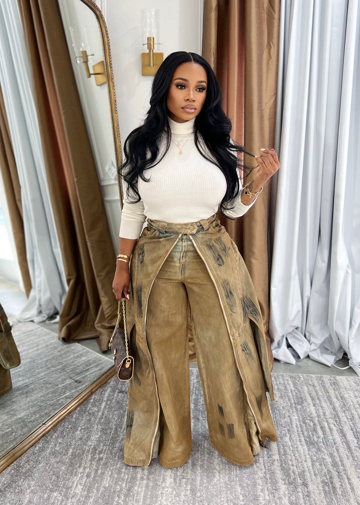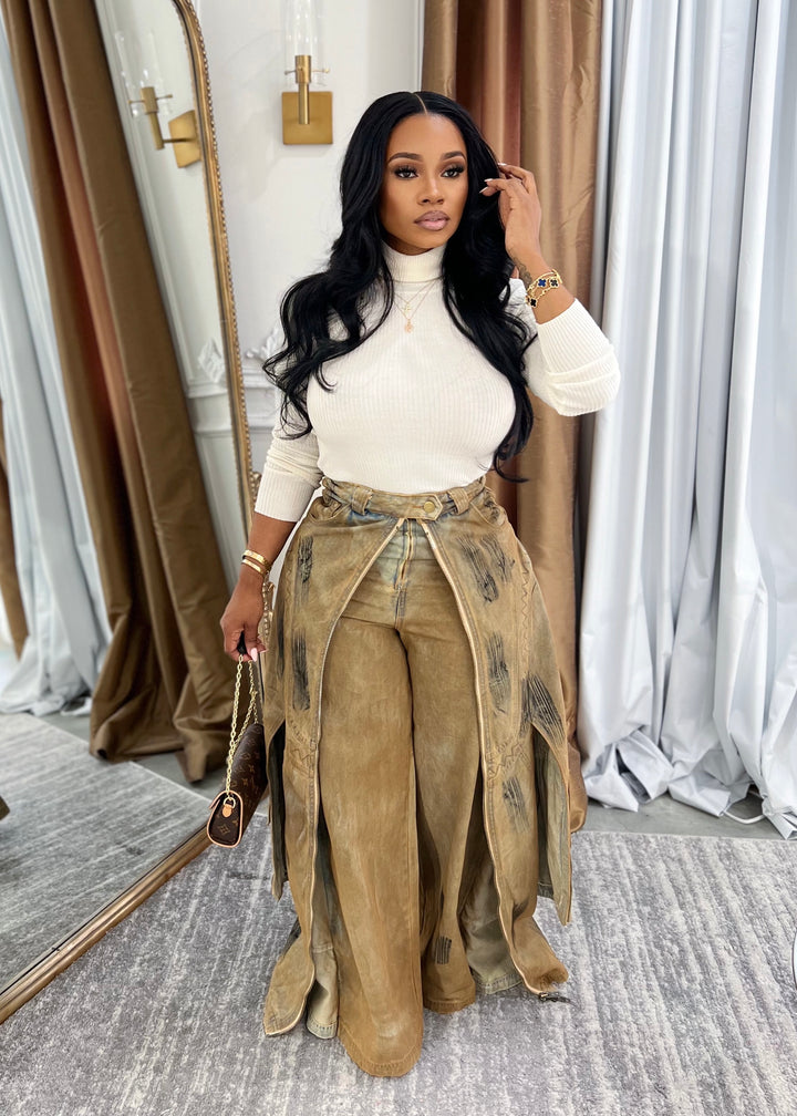 Model 5’2 wearing a size small no stretch 65% cotton 35% polyester front zipper closure you can wear this look as jeans or a skirt