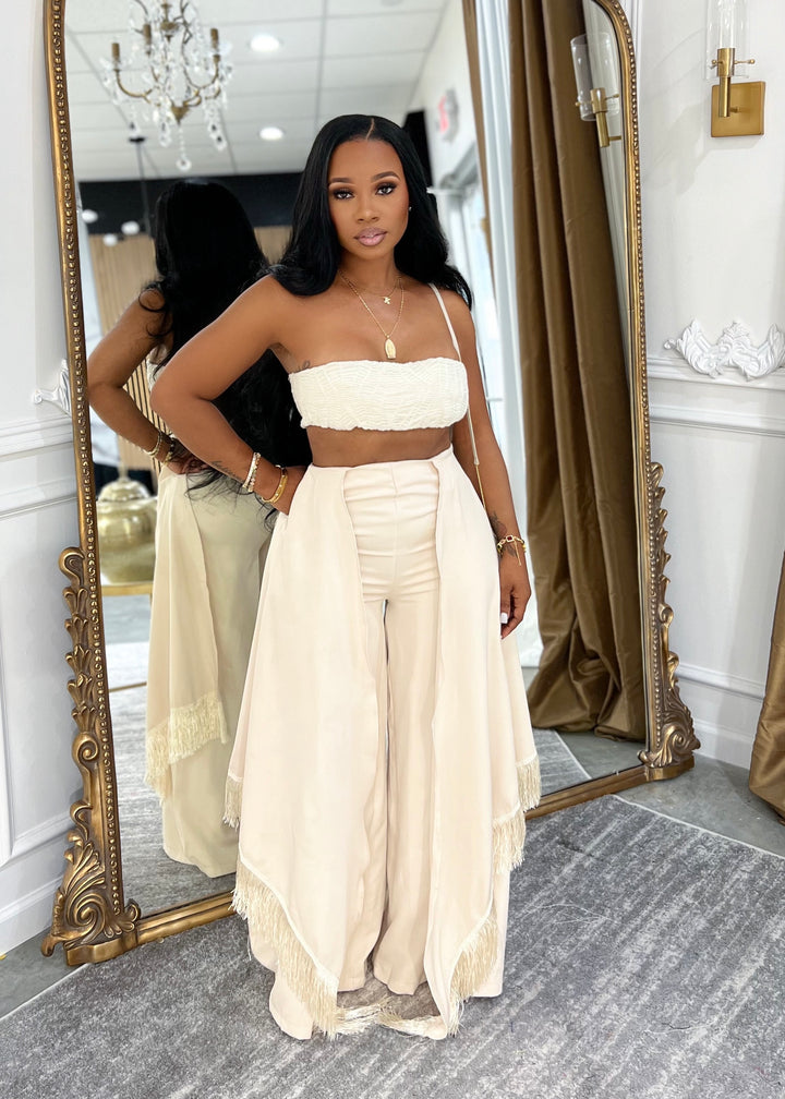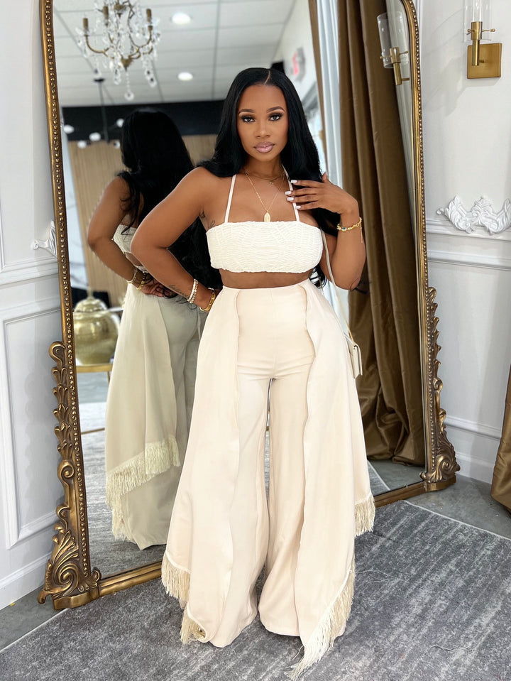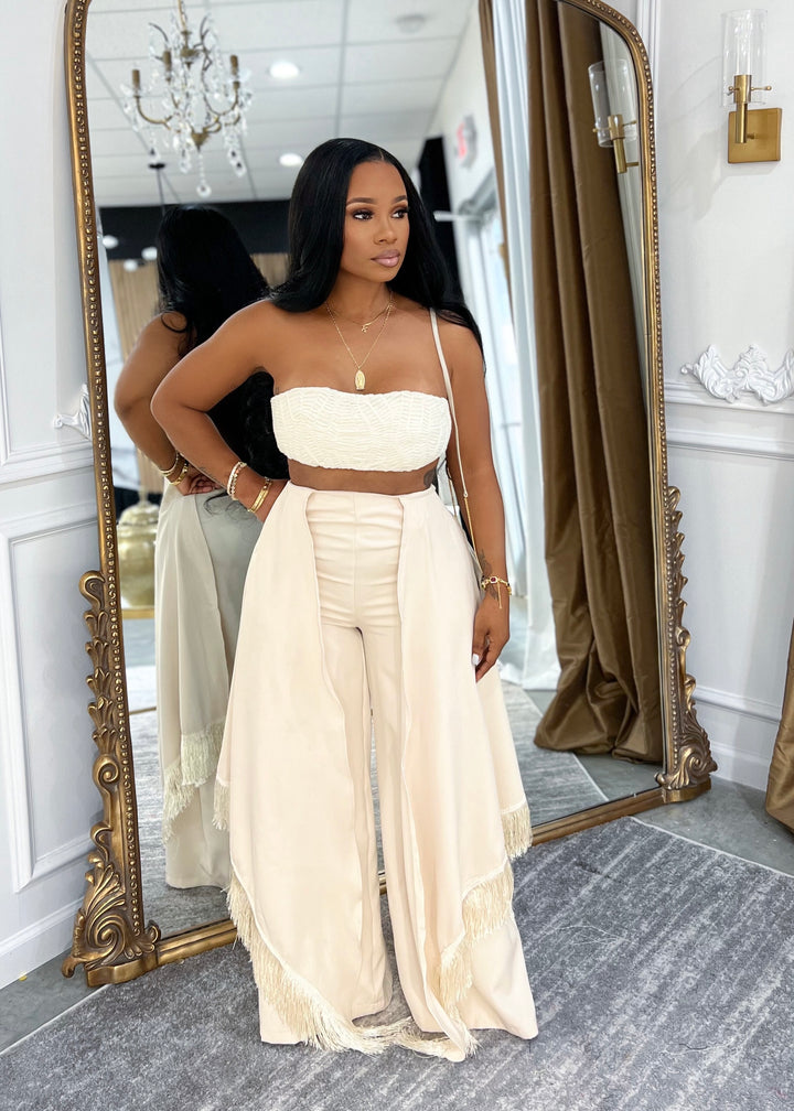 Model 5’2 wearing a size small no stretch high rise pants with back zipper tube halter top 95% polyester 5% spandex