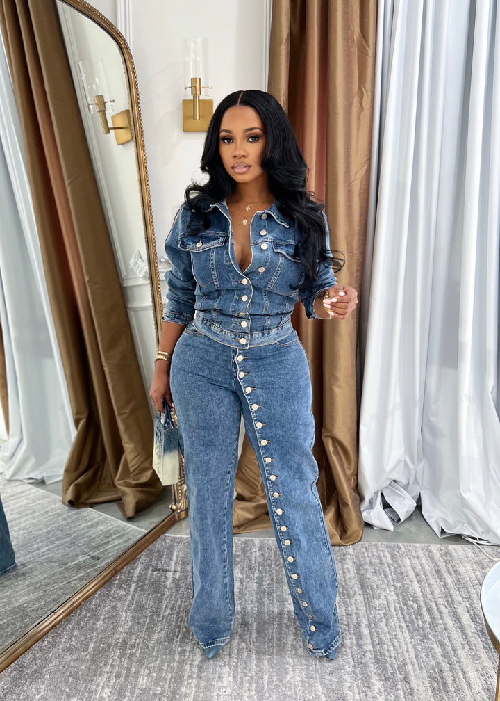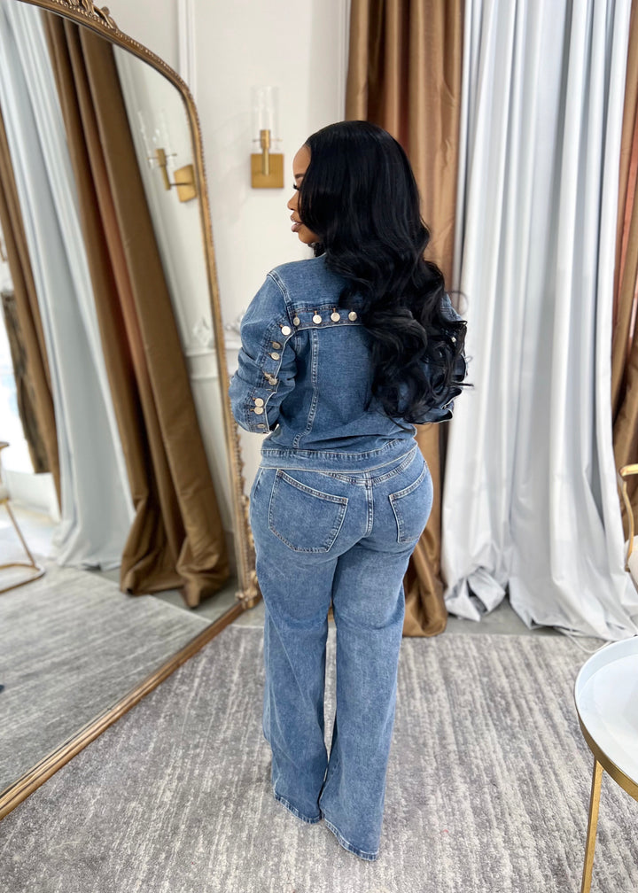 model 5’2 wearing a size small good stretch 96% cotton 3% spandex 1% elastane full button up denim jacket with matching jeans