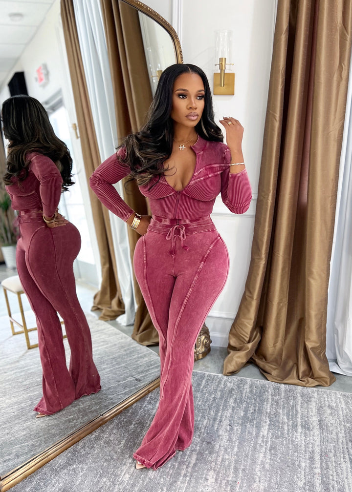 Model 5’2 wearing a size small good stretch front zipper jacket flare pants 96% cotton 4% spandex inseam 34”