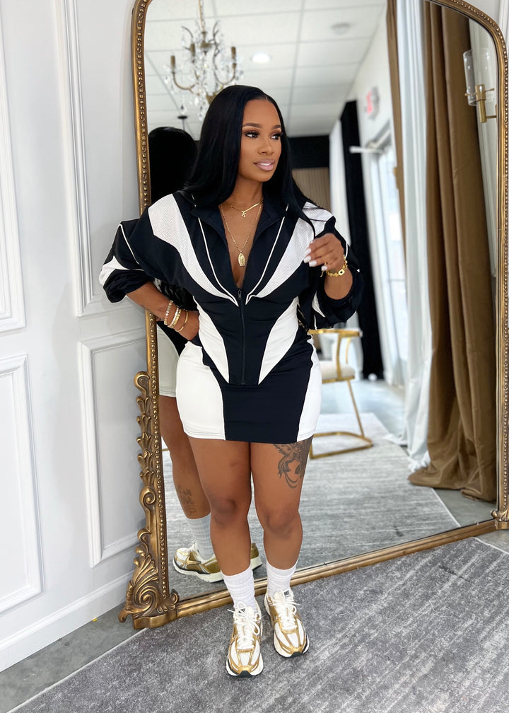 Model 5’2 wearing a size medium little stretch elastic waist skirt underlined front zipper jacket 100% nylon
