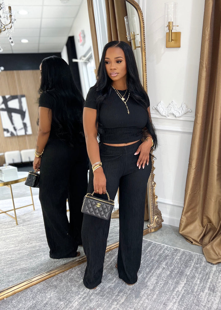 Model 5’2 wearing a size small good stretch cropped top wide leg stretch pants no closure 92% polyester 8% spandex