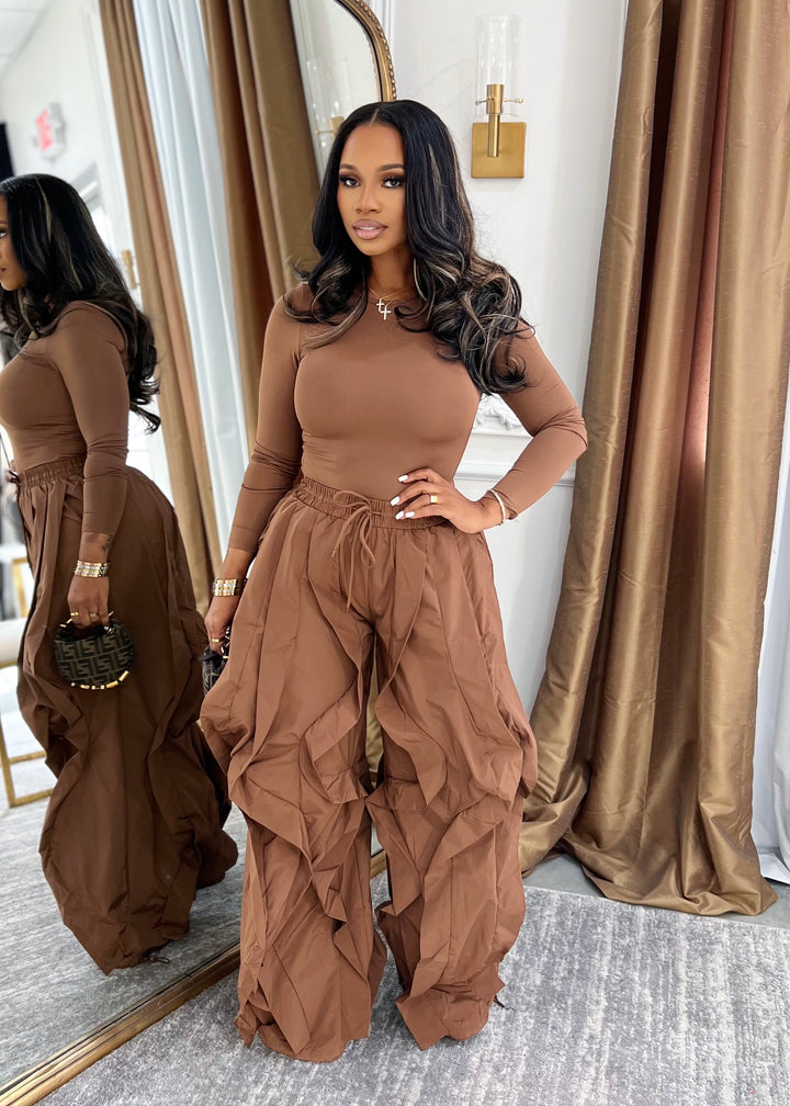 Model 5’2 wearing a size small good stretch bodysuit windbreaker pants with elastic waist 98% polyester 2% spandex